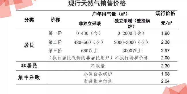 集中采暖用氣:居民小區(qū)自備鍋爐氣價(jià)為居民用氣一階氣價(jià)1.98元每立方米,市政集中供暖氣價(jià)為:2.04元每立方米。