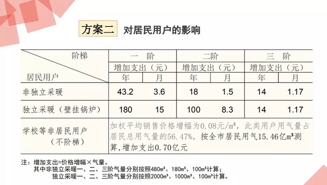 一是非獨(dú)立采暖用戶,按照調(diào)整后的居民用氣一階銷售價(jià)格,一階年最高氣量為480立方米計(jì)算,每戶年增加支出57.6元,月增加支出4.8元;二階最高氣量180立方米氣量計(jì)算,每戶年增加支出25.2元,月增加支出2.1元,對用氣量達(dá)到三階年最高氣量660立方米以上的用戶,氣價(jià)增幅0.18元每立方米,用氣100立方米,增加支出18元。