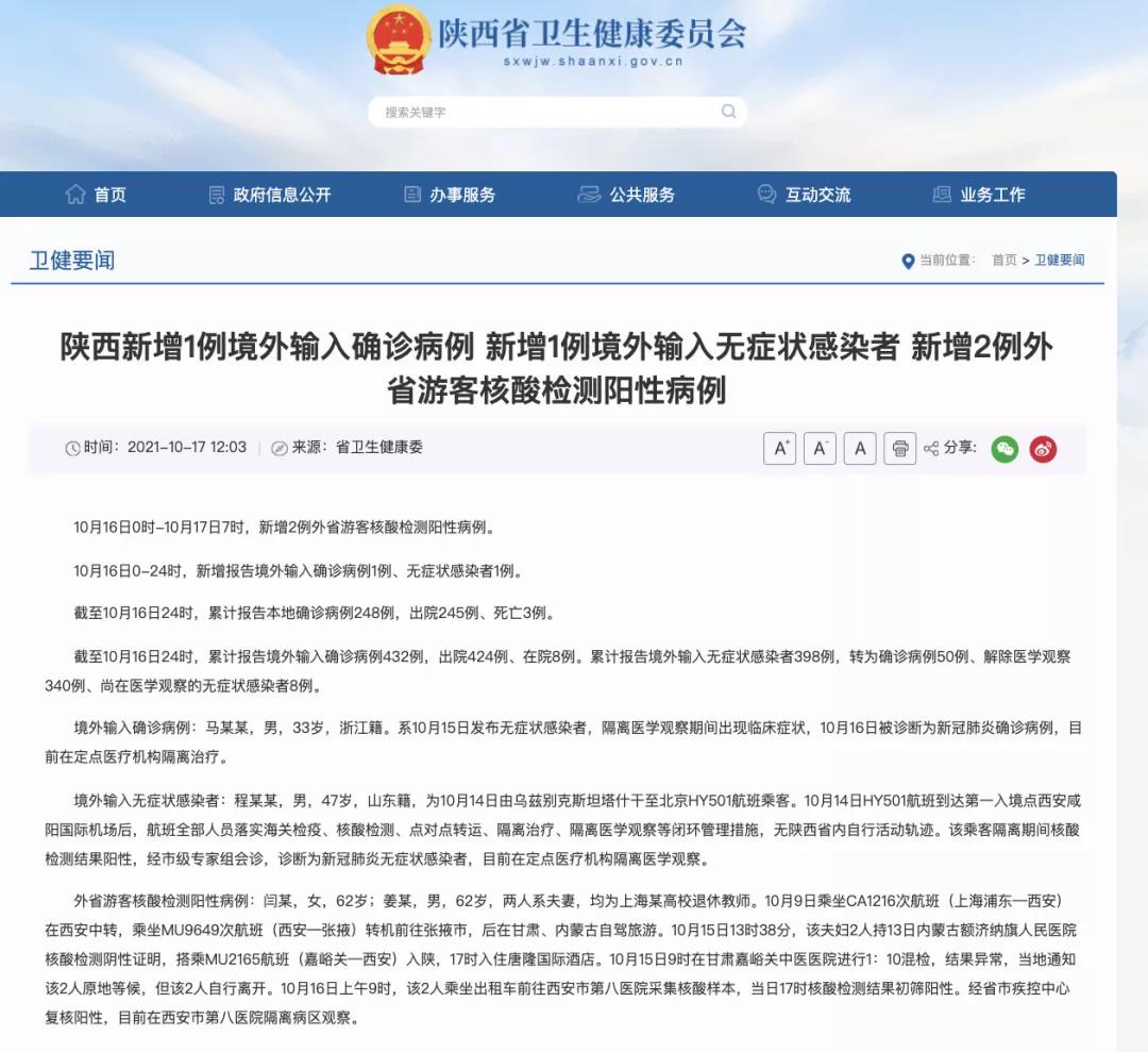 陜西衛(wèi)健委剛剛通報(bào):10月16日0時(shí)-10月17日7時(shí),新增2例外省游客核酸檢測(cè)陽性病例。