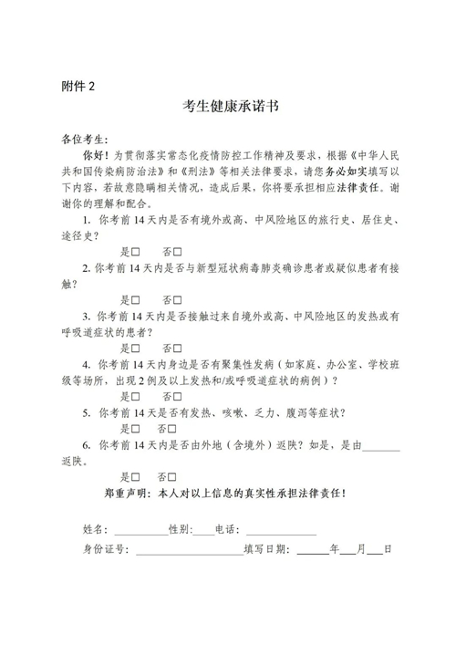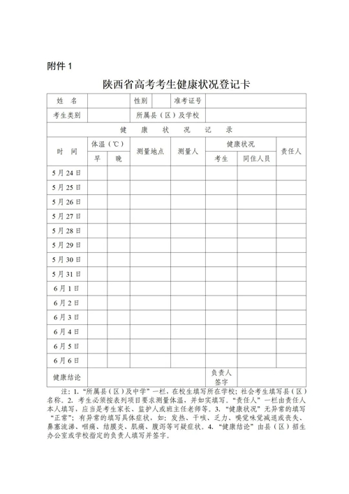 健康監(jiān)測(cè)。考生在高考前14天到高考結(jié)束應(yīng)進(jìn)入靜態(tài)管理,堅(jiān)持做到非必要不流動(dòng),不到人群流動(dòng)性較大的場(chǎng)所活動(dòng),不接觸有疫情風(fēng)險(xiǎn)的人員,做好每日體溫測(cè)量、記錄并進(jìn)行健康狀況監(jiān)測(cè),填寫(xiě)《陜西省高考考生健康狀況登記卡》(附件1)和《考生健康承諾書(shū)》(附件2)?忌】等绯霈F(xiàn)異常狀況應(yīng)立即向?qū)W校和高考報(bào)名地考試機(jī)構(gòu)報(bào)告,不得謊報(bào)、瞞報(bào)。