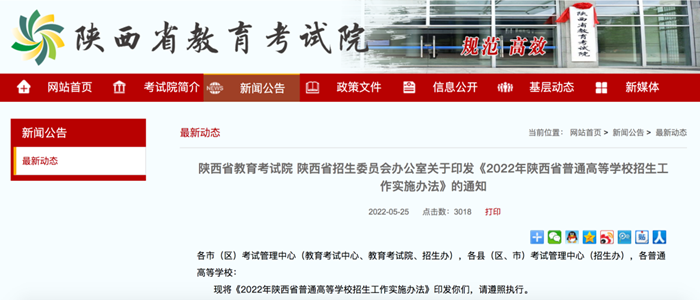 5月25日,陜西省教育考試院、陜西省招生委員會辦公室印發(fā)了《2022年陜西省普通高等學校招生工作實施辦法》,明確了陜西2022年高考考試、評卷、志愿填報招生錄取等政策。