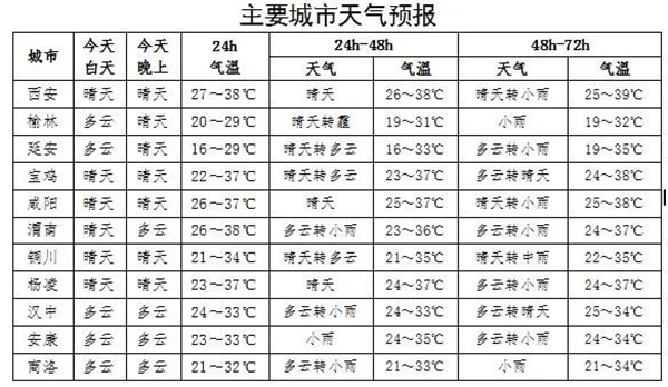 6日:全省多云間晴天。陜北部分地方、關中盆地大部分地方、陜南漢江沿線部分地方有35-37℃的高溫天氣,關中南部部分地方38-40℃、局地可達41-43℃以上。