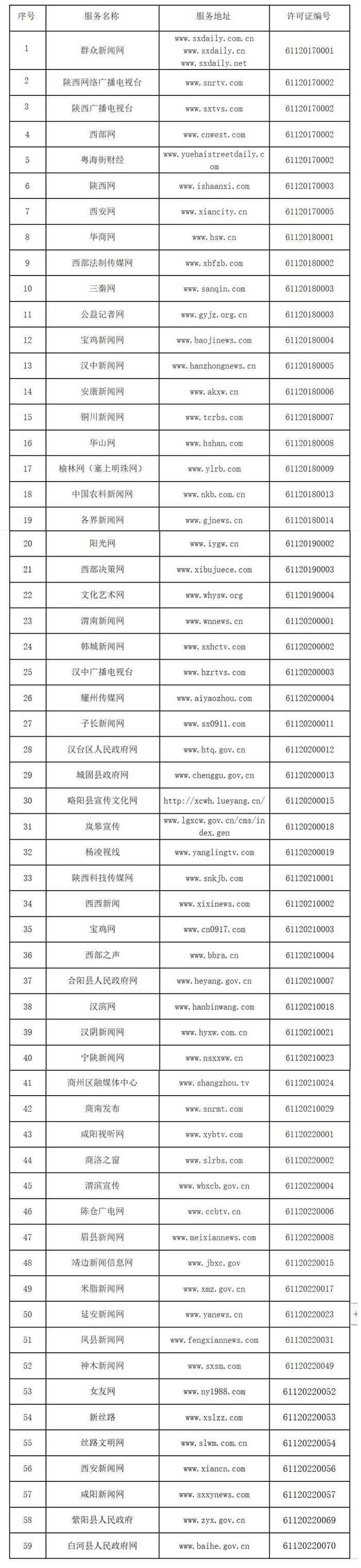 《互聯(lián)網(wǎng)新聞信息服務(wù)管理規(guī)定》實(shí)施以來,陜西省網(wǎng)信辦按照國家互聯(lián)網(wǎng)信息辦公室統(tǒng)一工作部署,組織開展屬地互聯(lián)網(wǎng)新聞信息服務(wù)許可審批工作,F(xiàn)將陜西省互聯(lián)網(wǎng)新聞信息服務(wù)單位相關(guān)許可信息予以公開,包括:服務(wù)主體136個,互聯(lián)網(wǎng)站59個,應(yīng)用程序130個,論壇2個,公眾賬號299個,共計490個服務(wù)項。