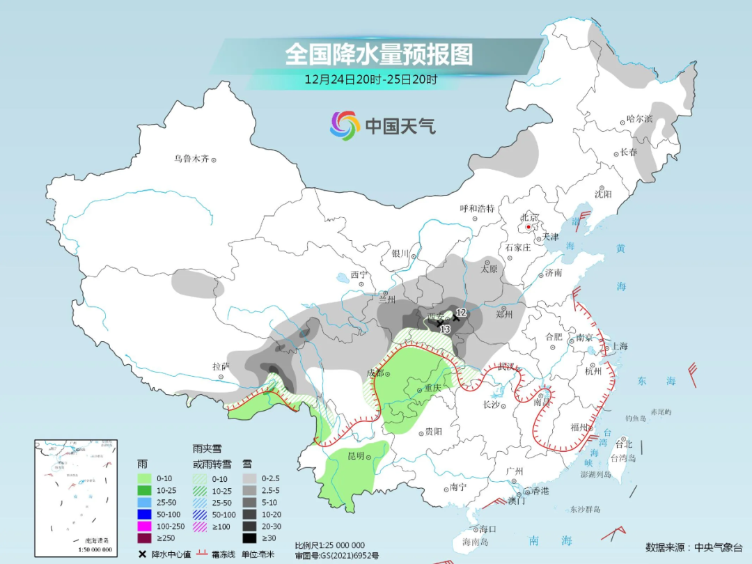 從24日夜間開始,西部地區(qū)的雨雪也將發(fā)展起來。中央氣象臺預(yù)計,24日夜間至25日,青藏高原東部、西北地區(qū)東部、華北西南部、黃淮西部、湖北西部、四川西部和北部等地有小到中雪或雨夾雪,局地大到暴雪。