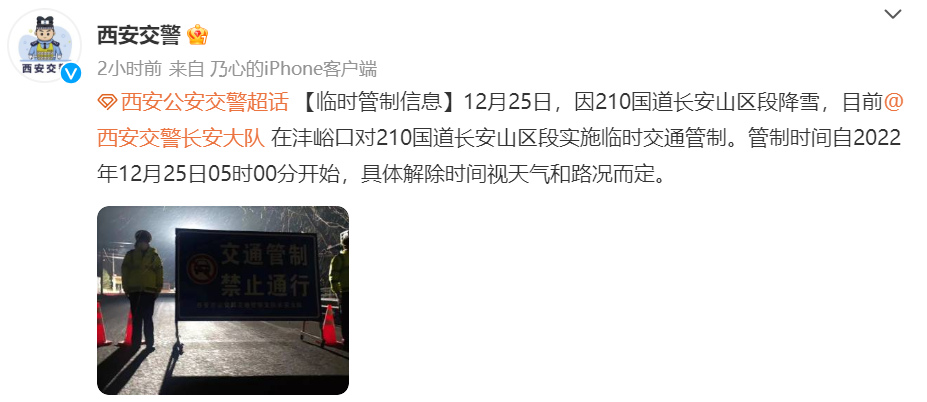 12月25日,因210國道長安山區(qū)段降雪,目前西安交警長安大隊在灃峪口對210國道長安山區(qū)段實施臨時交通管制。管制時間自2022年12月25日05時00分開始,具體解除時間視天氣和路況而定。