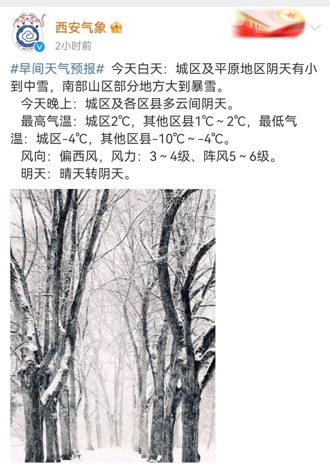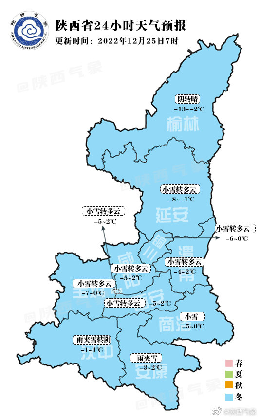 據(jù)陜西氣象最新預(yù)報,今天白天:榆林、延安北部陰天轉(zhuǎn)多云,延安南部、關(guān)中北部有小雪,局地有中雪。陜南中西部有雨夾雪或小雪。關(guān)中南部、陜南東部有小到中雪,寶雞南部局地、西安南部局地、渭南南部局地、商洛北部局地、秦巴山區(qū)局地有大到暴雪。陜北西部、關(guān)中西部、陜南中西部、秦巴山區(qū)日平均氣溫下降 4-6℃。陜北有 4-5 級偏北風(fēng)。早上關(guān)中中西部、陜南西部、秦嶺山區(qū)有輕霧。