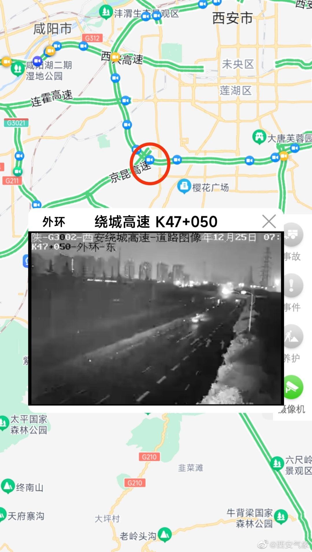 據(jù)西安氣象最新預(yù)報,配合雷達(dá)實況選取了西三環(huán)環(huán)城高速監(jiān)控視頻可以看到已經(jīng)在下了,截圖不太明顯;西漢、藍(lán)商高速已經(jīng)在下并且有些路段有積雪,今日出行的小伙伴除了防寒保暖,還請注意道路安全。