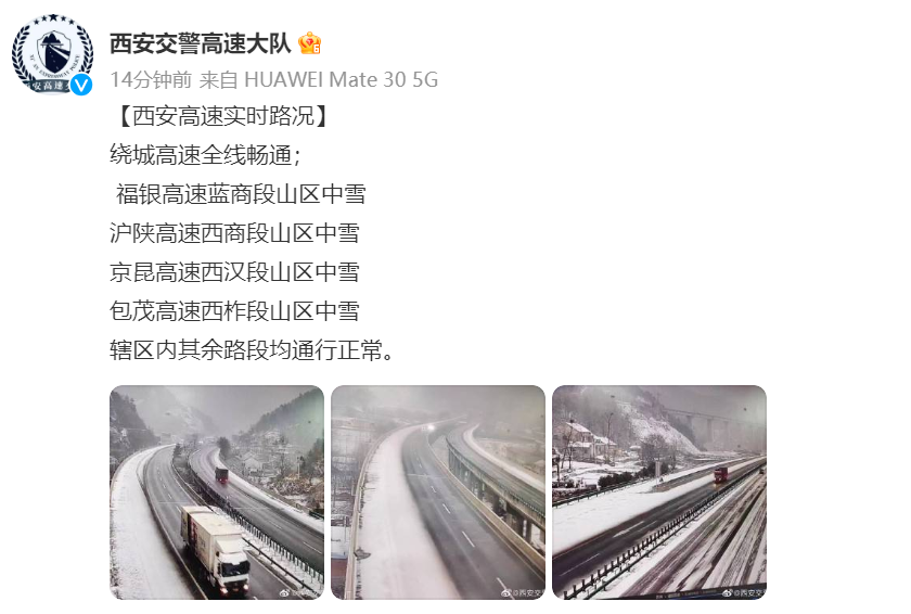 繞城高速全線暢通;福銀高速藍(lán)商段山區(qū)中雪;滬陜高速西商段山區(qū)中雪 ;京昆高速西漢段山區(qū)中雪;包茂高速西柞段山區(qū)中雪;轄區(qū)內(nèi)其余路段均通行正常。