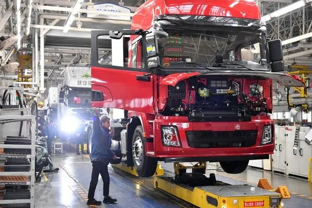 工業(yè)機(jī)器人揮舞長臂,工人在生產(chǎn)線上緊張忙碌。在位于西安經(jīng)開區(qū)涇渭新城的陜汽控股集團(tuán),總裝車間正馬力全開,每6分鐘就有一輛整車從這里下線。