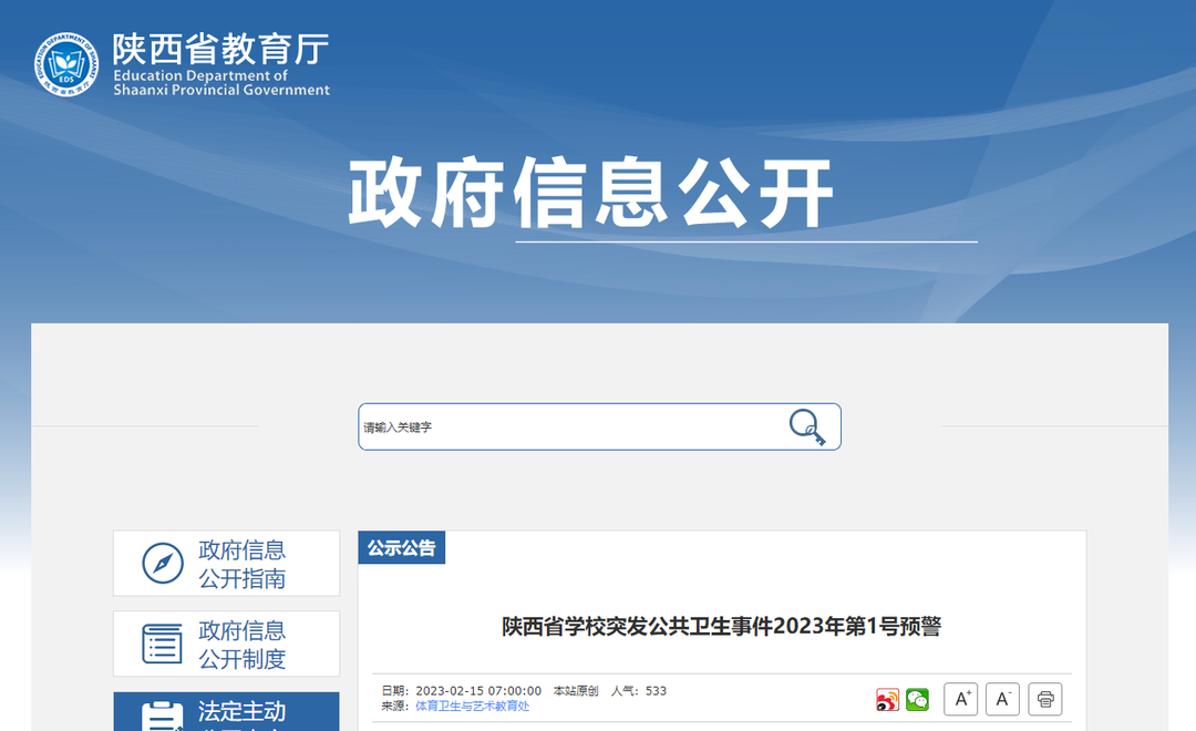 新冠感染:監(jiān)測數(shù)據(jù)及專項(xiàng)調(diào)查數(shù)據(jù)顯示,陜西省城市和農(nóng)村均已過新冠感染高峰,已到流行末期,但隨著新型變異毒株的出現(xiàn)及出入境人員的增加,各級各類學(xué)校仍需做好防控工作。