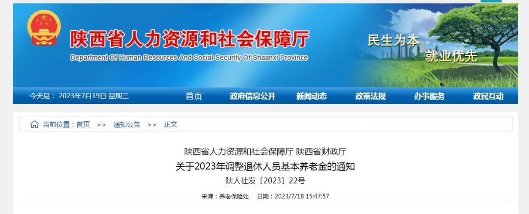 7月18日,陜西省人社廳在官網(wǎng)發(fā)布《關(guān)于2023年調(diào)整退休人員基本養(yǎng)老金的通知》(下簡(jiǎn)稱(chēng)《通知》),通知提到,退休人員每人每月增加40元,從2023年1月1日起執(zhí)行。