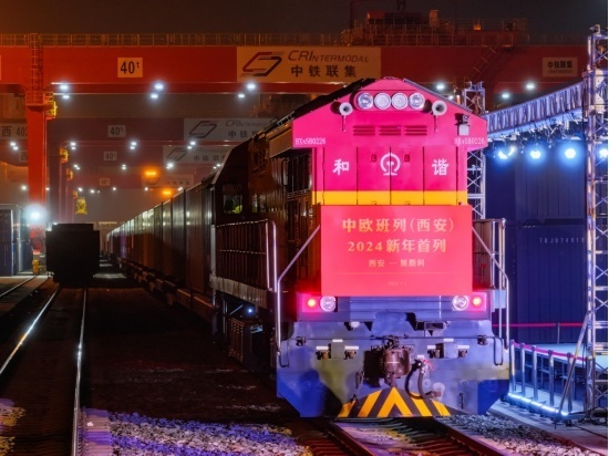 2024年元旦零點整,伴隨著悠揚汽笛聲,中歐班列長安號2024年首趟班列從西安國際港站始發(fā)。班列55個集裝箱滿載紙塑鋁復(fù)合材料和百貨等,經(jīng)阿拉山口口岸出境,將最終抵達俄羅斯莫斯科,此次“跨國旅程”約7206公里,全程運行13天。