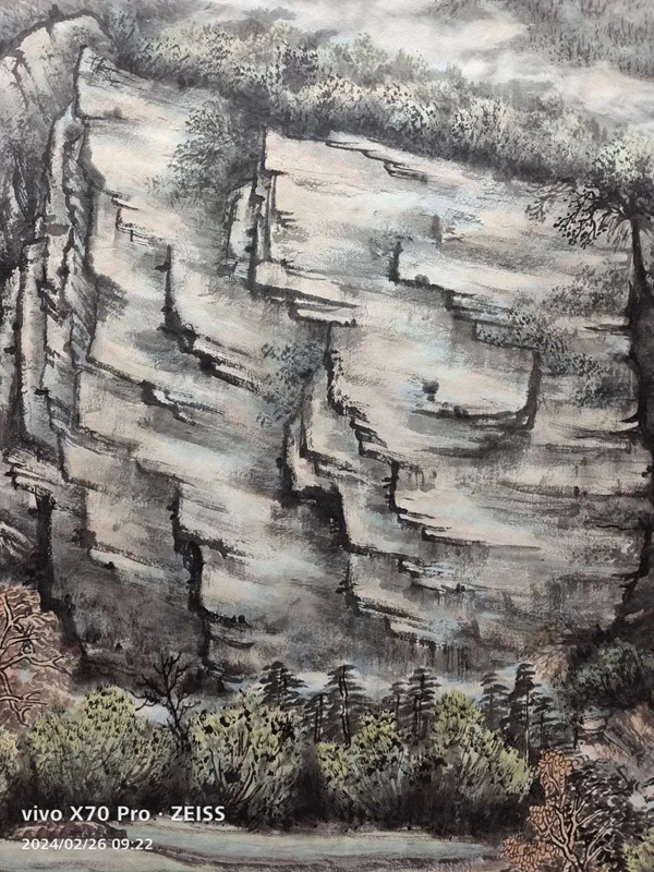 著名畫家靳尚誼先生曾強(qiáng)調(diào)美術(shù)的實(shí)踐性,只有扎實(shí)地實(shí)踐才有真功,才有高度。我覺得,要畫溪山這樣一座名山,范寬在過去已經(jīng)畫得夠大了, 若在現(xiàn)今要表現(xiàn)它的宏偉氣派,必須以一個現(xiàn)代人的視野去展現(xiàn),求得良好的視覺沖擊。因此,我決定以我畫室的現(xiàn)有條件,最大畫一幅丈二尺幅的溪山。