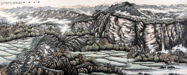 基于這樣的思考,一幅溪山作品的構(gòu)圖在腦海漸漸形成,它將是一幅以綠色為基調(diào)的青山綠水圖畫,是人與自然和諧共生的美麗情愫。全畫由近、中、遠(yuǎn)三部分構(gòu)成,以平視和仰視的角度分別體現(xiàn)。近景畫出幾塊巨大嶙峋的山石,配以年輪久遠(yuǎn)的古松和新植的翠松。背后是暮春的梯田、村落,小河邊有洗衣的婦女和在田間勞作的人們。這些符號結(jié)合在一起,所要表現(xiàn)的就是時空久遠(yuǎn)與現(xiàn)實(shí)的延伸,人與自然依然和諧共生共榮,增加現(xiàn)代生活氣息;中景突出巨碑式的丹霞層巖,巖上飛流而下的飛瀑,表現(xiàn)溪山的巍峨與壯觀,這是全畫中必須用心刻畫的細(xì)節(jié)。溪山的厚重、峻峭,都要通過有力的線條表現(xiàn)出來,增強(qiáng)溪山的氣勢和偉岸,但又要注意不能給人以壓抑感,要以云遮霧掩顯現(xiàn)它的神奇和神秘;遠(yuǎn)景是大山背后的遠(yuǎn)山層巒,分三層漸次疊加。最上一層是春暉映照的暖色遠(yuǎn)山,對整個的冷色基調(diào)形成對比和映襯,使畫面不至于過于沉郁。總之,我要表現(xiàn)的是春色之中磅礴而壯麗的溪山。
