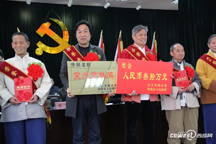 華陰市為“華陰老腔”頒發(fā)突出貢獻(xiàn)獎,為老腔藝人們頒發(fā)了榮譽證書。西部網(wǎng)訊(通訊員 楊雷雷 孟晟博) “華陰老腔”榮登2016年中央電視臺春節(jié)聯(lián)歡晚……