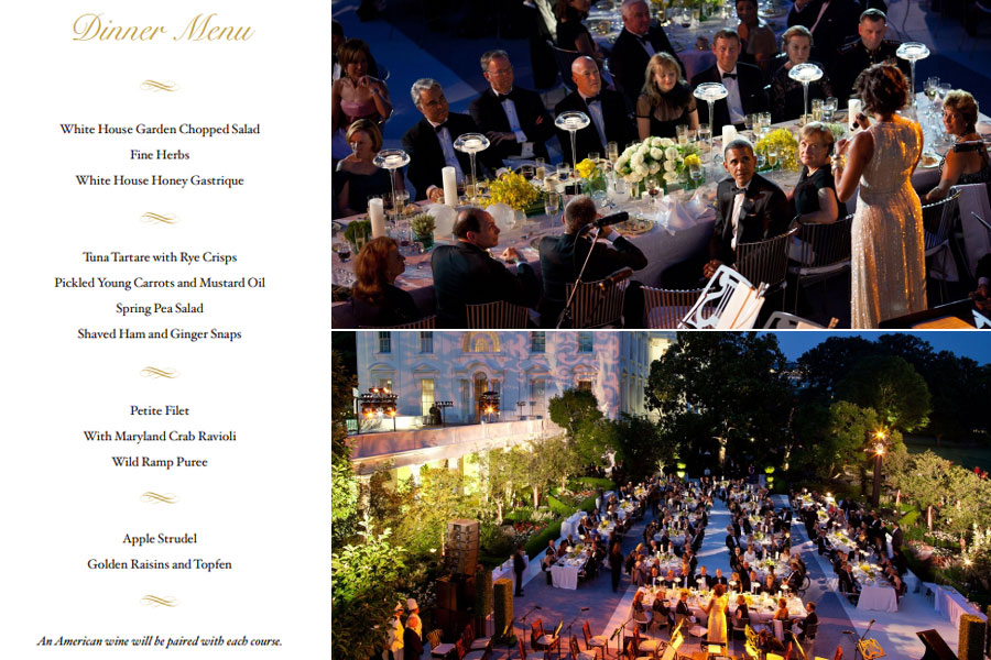 美國白宮2011年10月13日迎來了韓國總統(tǒng)李明博的訪問。當(dāng)天晚上,奧巴馬設(shè)國宴款待李明博。白宮官網(wǎng)在介紹國宴菜品時說,當(dāng)晚的菜品是當(dāng)?shù)刈詈玫氖巢暮晚n國傳統(tǒng)風(fēng)味結(jié)合的成果。