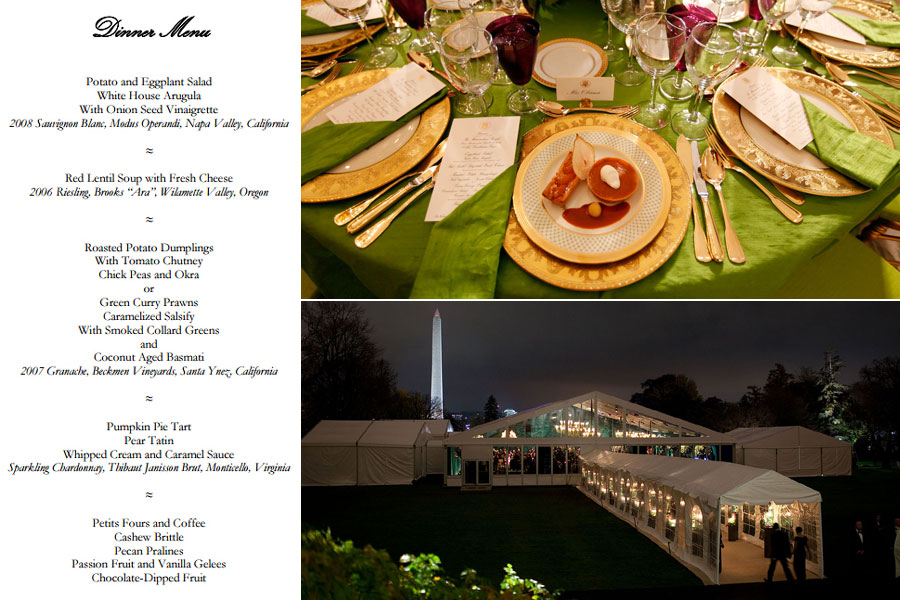 國(guó)宴的菜單是精心選定的,其中專門為素食主義者辛格準(zhǔn)備了鮮美素食。宴會(huì)菜譜主打印度和美國(guó)時(shí)令菜肴,頭道菜是土豆和茄子沙拉。甜點(diǎn)有南瓜餡餅、涂有生奶油和焦糖淋醬的梨撻,每道甜點(diǎn)都會(huì)配有不同口味的紅酒。