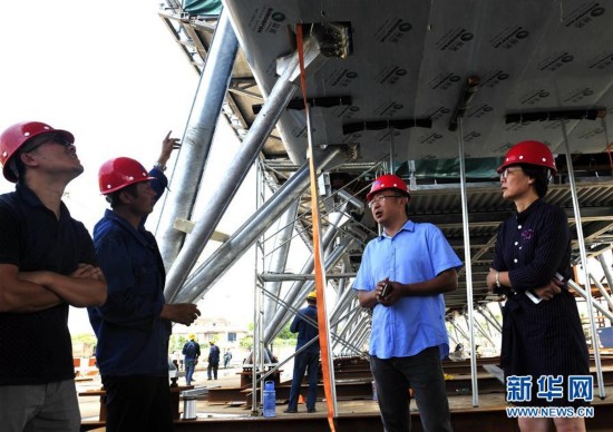 中國(guó)電子進(jìn)出口總公司費(fèi)拉茲站建設(shè)項(xiàng)目組經(jīng)理曹虹(右一)和副經(jīng)理焦陽(yáng)(右二)在位于上海的預(yù)拼裝現(xiàn)場(chǎng)檢查施工進(jìn)度(8月25日攝)。