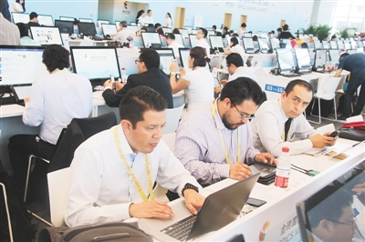 | 9月5日,第九屆金磚國家領(lǐng)導(dǎo)人廈門會晤閉幕,外國媒體積極報道會議進程。圖為5日,來自墨西哥的多家媒體記者正在新聞中心忙碌。 |