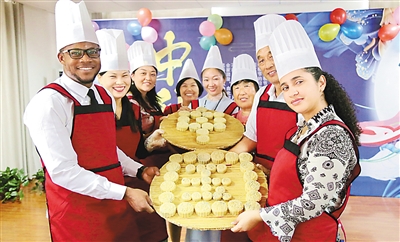 9月26日,山東省東營(yíng)市東營(yíng)區(qū)勝利街道勝景社區(qū)居民活動(dòng)室里,山東科瑞控股集團(tuán)的兩名外籍員工姆吉卡(右)、阿莫德(左)和社區(qū)居民在專業(yè)糕點(diǎn)師指導(dǎo)下學(xué)習(xí)制作月餅,迎接中國(guó)國(guó)慶和中秋佳節(jié)的到來(lái)。xB2安康新聞網(wǎng)