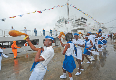 | 圖為當?shù)孛癖姎g迎到訪的和平方舟醫(yī)院船。 |