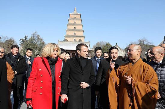 “參觀完兵馬俑后,馬克龍總統(tǒng)一行趕往大雁塔。”陳晨說。中國佛教協(xié)會(huì)副會(huì)長、陜西省佛教協(xié)會(huì)會(huì)長、大慈恩寺方丈增勤法師陪同馬克龍總統(tǒng)一行參觀了大雄寶殿,并登上大雁塔;監(jiān)院道宏法師為其介紹了大慈恩寺及大雁塔的歷史傳承和玄奘法師西行求法的精神。分析人士表示,馬克龍此次選擇大慈恩寺、大雁塔作為主要參觀點(diǎn),是因?yàn)槠渑c“絲綢之路”的密切關(guān)系,也表明了馬克龍希望傳遞出歐洲和中國將在“一帶一路”建設(shè)的框架內(nèi)加強(qiáng)合作的信號(hào)。