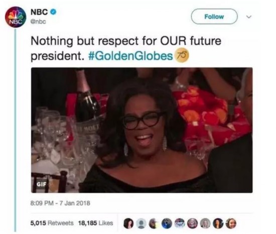 不過這則推文引發(fā)了大量爭議,NBC之后將其刪除,并解釋稱“只是借用頒獎禮現(xiàn)場的玩笑,并非政治聲明”,但還是不難看出媒體及民眾對奧普拉的諸多期待。