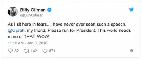 Billy Gilman:我現(xiàn)在坐在這兒淚流滿面……我從來沒聽過這樣的演講,奧普拉,我的朋友,請競選總統(tǒng)吧,這個世界需要更多這樣的聲音。