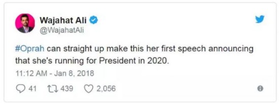 Wajahat Ali:奧普拉可以直接把這次演講當(dāng)做宣布參選2020年總統(tǒng)競選的演講。