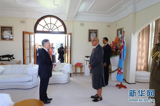 1月23日,中國新任駐斐濟(jì)大使錢波(手持國書者,左)在斐濟(jì)國賓館向斐濟(jì)總統(tǒng)孔羅特遞交國書。新華網(wǎng)發(fā)(圖片由中國駐斐濟(jì)大使館提供)fcE安康新聞網(wǎng)