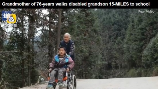 英國(guó)《每日郵報(bào)》1月22日發(fā)表文章,關(guān)注中國(guó)廣西76歲老太史玉英的感人故事。老人每天都會(huì)步行24公里的路,用一把破舊的輪椅推著患腦癱的孫子上學(xué)。報(bào)道稱,她“4年如一日,風(fēng)雨無(wú)阻,意志堅(jiān)強(qiáng)。”