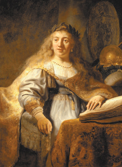 在《穿金邊斗篷的少女》這幅作品中,為了凸顯對(duì)明暗光影效果的處理能力,畫(huà)中人身著黑色斗篷,連同灰黑的背景,大面積的暗部將作為重點(diǎn)的人物面部烘托出來(lái),宛若聚光式的映照,透過(guò)少女面部精致的五官,觀眾仿佛感受到了正款款流出的情思。在倫勃朗筆下,美不再僅僅是對(duì)漂亮容顏的寫(xiě)真,光影之間,鮮活的人物個(gè)性塑造才是其孜孜以求的關(guān)鍵,成為最打動(dòng)人心的地方,畫(huà)布里充滿(mǎn)被欣賞的氣氛。而他少有的歷史畫(huà)作,也無(wú)不彰顯其過(guò)人的天資。在《書(shū)房中的女神密涅瓦》中,老到而精煉的技法、逼真的物象處理、和諧的光影關(guān)系等,很難讓人相信這幅巨作出自年僅29歲的倫勃朗之手。