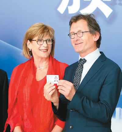 五月二日,上海為伯納德·費(fèi)林加等七名外籍人士頒發(fā)外國人永久居留身份證和居留許可,這將給他們出入境、在華生活和工作帶來諸多便利。圖為諾貝爾獎得主伯納德·費(fèi)林加和夫人一起在展示領(lǐng)取的永久居留身份證。9Lf安康新聞網(wǎng)