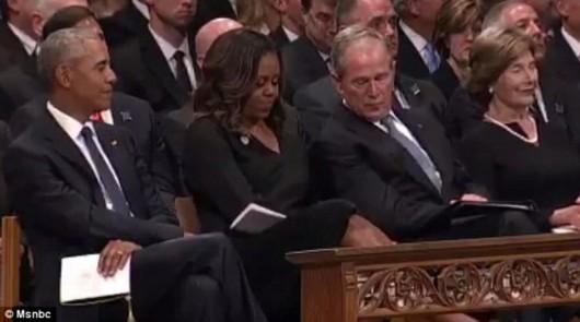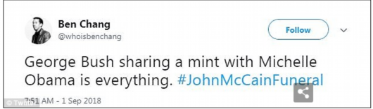 原標(biāo)題:小布什在麥凱恩追悼會(huì)上給米歇爾傳糖 美國(guó)網(wǎng)友被暖到了