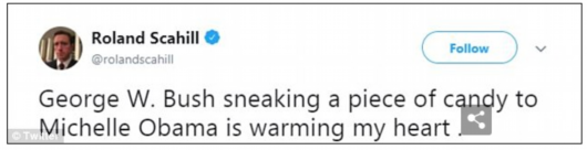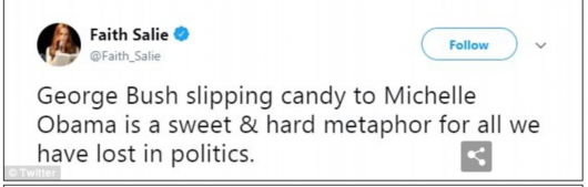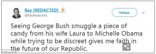 “看到小布什從妻子手中接過(guò)糖果給米歇爾,同時(shí)又試圖保持謹(jǐn)慎,讓我對(duì)共和黨的未來(lái)充滿希望。”