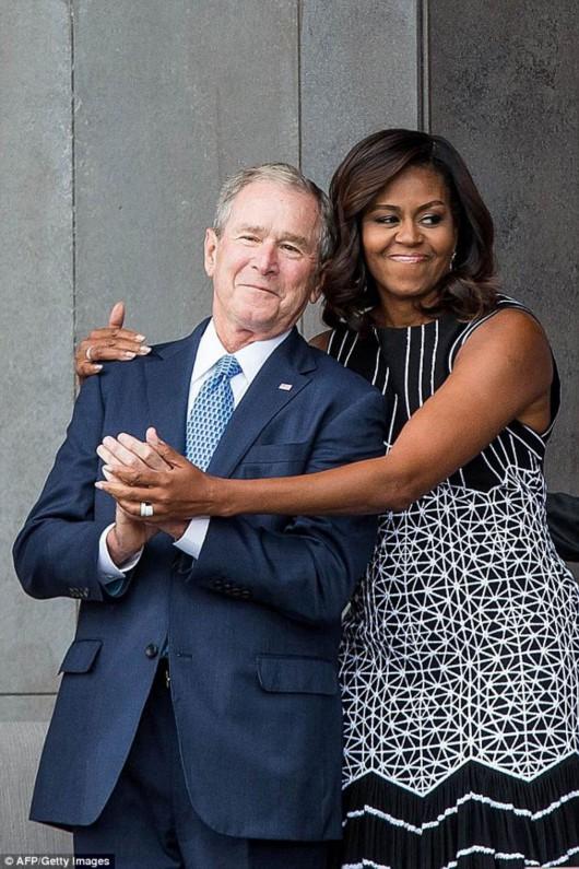 米歇爾在美國(guó)非裔美國(guó)歷史文化博物館的落成典禮上擁抱小布什