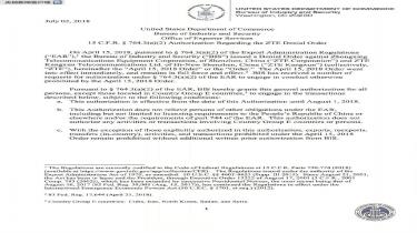 美國東部時間7月2日,美國商務(wù)部發(fā)布公告,暫時、部分解除對中興通訊公司的出口禁售令。 公告稱:從公告發(fā)布之日起至8月1日,在有限條件下解除……