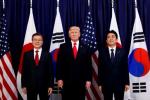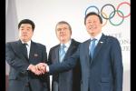 圖為1月20日,韓國(guó)代表團(tuán)團(tuán)長(zhǎng)都鐘煥(右)和朝鮮代表團(tuán)團(tuán)長(zhǎng)金一國(guó)在國(guó)際奧委會(huì)主席巴赫(中)主持的歡迎儀式上握手!