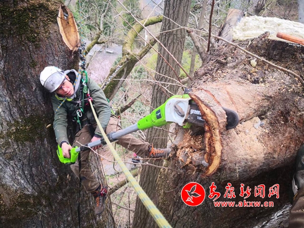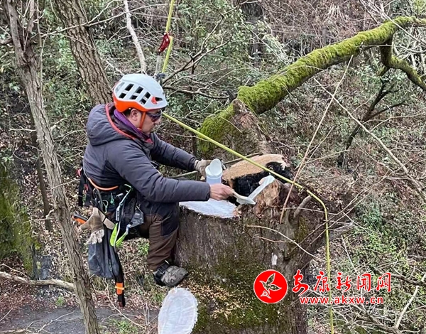 “在修復(fù)期間,我們聘請了國內(nèi)最頂尖的攀樹師、修剪師,攀登到樹頂,對樹體的枯枝、病腐枝進(jìn)行了清理,然后對所有樹洞存在腐爛的地方,使用消毒滅菌的藥物進(jìn)行處理,對影響樹體生長,可能造成二次傷害位置的漏洞、樹洞進(jìn)行了封堵。我們使用的攀樹、修剪技術(shù)目前在我們陜西省內(nèi)屬于首次的應(yīng)用,通過這次修剪之后讓陽光照進(jìn)傷口,使古樹再次萌發(fā)了蓬勃生長的動(dòng)力”,白河縣林業(yè)局自然保護(hù)地管理辦公室主任肖培軍介紹說。