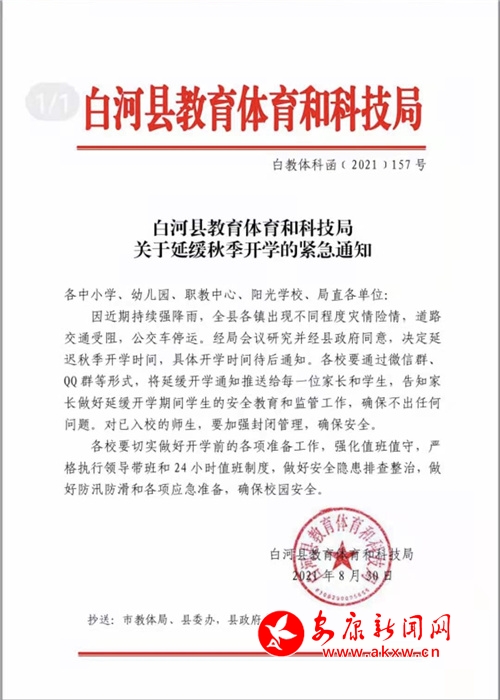 本網(wǎng)訊 因近期持續(xù)強降雨,白河全縣各鎮(zhèn)出現(xiàn)不同程度災(zāi)情險情,道路交通受阻,公交車停運。8月30日,白河縣教育體育和科技局發(fā)布《關(guān)于延緩秋季開學(xué)的緊急通知》(以下簡稱《通知》),決定延遲秋季開學(xué)時間,具體開學(xué)時間待后通知。