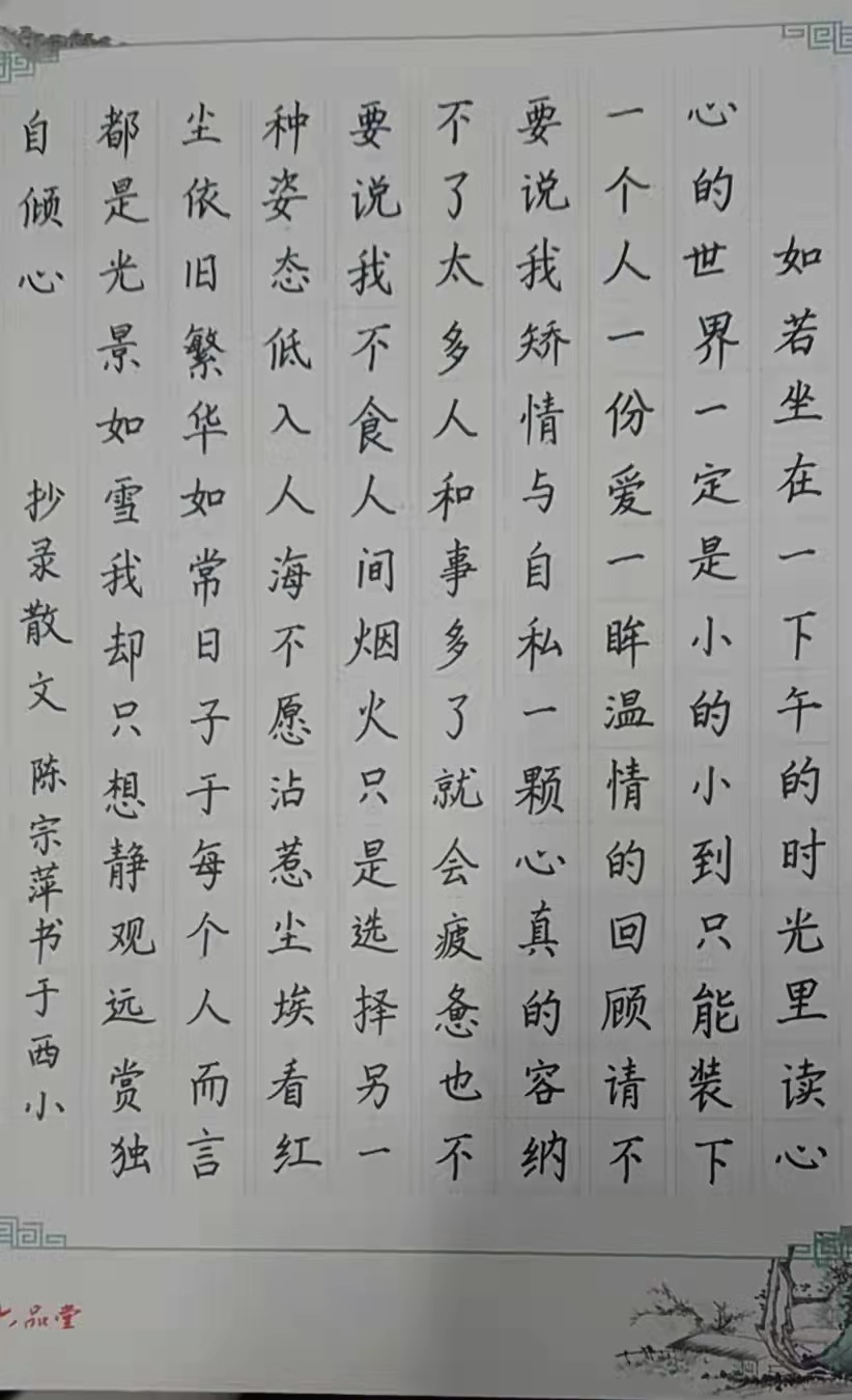 本次教師基本功大賽比賽內(nèi)容為“三筆一畫”,即硬筆字、粉筆字、毛筆字和簡(jiǎn)筆畫。其中硬筆書寫內(nèi)容為教育方針,粉筆和毛筆書寫內(nèi)容為古詩(shī)《靜夜思》,簡(jiǎn)筆畫內(nèi)容不限,自行創(chuàng)作。比賽現(xiàn)場(chǎng),老師們聚精會(huì)神地書寫,專心致志的繪畫,墨香蕩漾著整個(gè)校園。鋼筆的一筆一畫中規(guī)中矩,結(jié)構(gòu)和諧,彰顯字如其人的道理;板書則美觀大方,橫豎撇捺折,筆鋒掠過(guò),一股明麗清新之氣撲人眉宇;簡(jiǎn)筆畫勾畫了了,像簡(jiǎn)明、得體、通俗的語(yǔ)言,傳達(dá)著富有感染力的情愫。