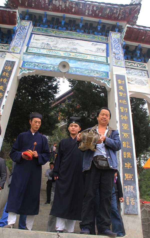 只有在每年的三月三、九月九日這兩天祖師殿舉辦廟會。附近和遠(yuǎn)處的香客游人紛至沓來,敬神觀景,游山朝拜,休閑娛樂,已成為旅游的一處勝境。這種風(fēng)俗已經(jīng)沿襲了好幾個朝代。10月21日重陽節(jié),記者來到流水鎮(zhèn)祖師殿時,正巧碰上流水鎮(zhèn)水產(chǎn)站的單東林在兩名道士的陪同下進(jìn)行放生,單東林手中捧著一只五、六十斤的一只大龜,據(jù)他介紹,這只龜是在集鎮(zhèn)上從一位漁民手中買的,已經(jīng)是第二次買這個龜了,頭一次買了把它放進(jìn)了湖里,沒想到,過了幾個月,他領(lǐng)著孫子在集鎮(zhèn)上逛,看見有個漁民在賣一只龜,他當(dāng)時一眼就認(rèn)出這就是他原來放生的那只。他掏錢把這只龜又買了下來。等到九月九日廟會這天,請祖師殿廟的道士進(jìn)行放生。
