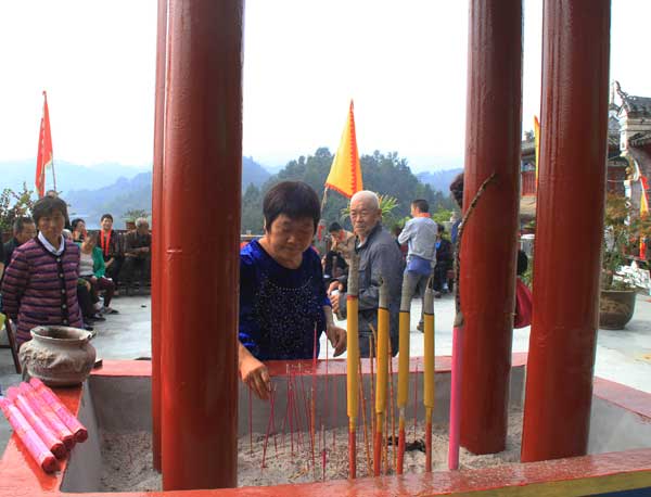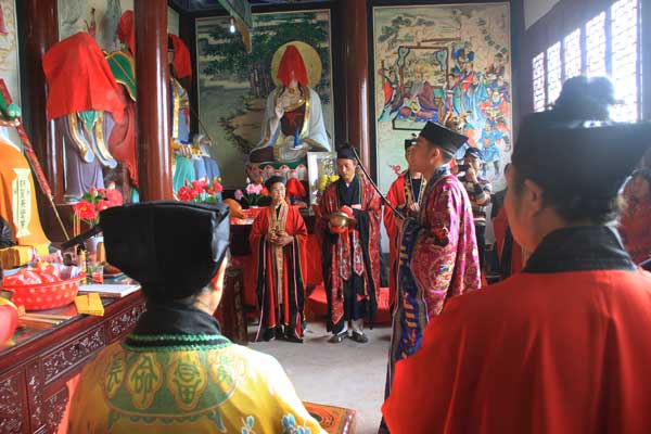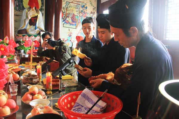 在祖師殿的正殿里,道長馬世富帶領(lǐng)幾名道士正在進(jìn)行開光儀式。據(jù)悉,祖師殿最早建成時間已無從考證,但據(jù)碑文記載,清嘉慶十八年重修,文革期間遭嚴(yán)重毀壞。公元2000年經(jīng)多方籌款,重修祖師殿,F(xiàn)分為上下兩殿和鐘樓等建筑宏偉,古色古香,精雕細(xì)琢,巧奪天工。