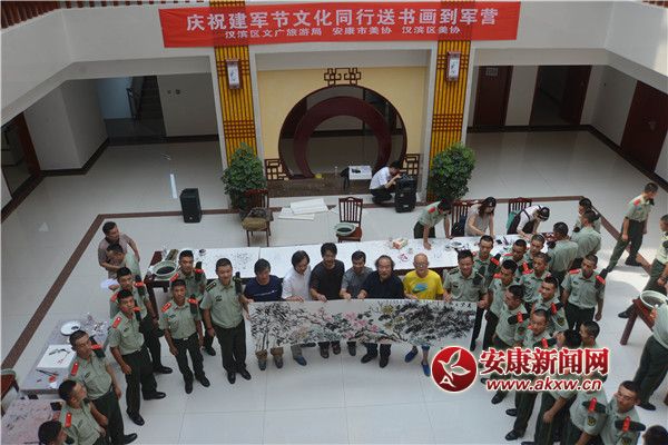 據(jù)了解,本次慶祝八•一建軍節(jié),漢濱區(qū)文廣旅游局、市、區(qū)美術(shù)家協(xié)會送書畫到軍營活動走進武警安康支隊,旨在在建軍90周年到來之際,以送書畫的方式,慰問廣大一線武警官兵。進一步增進軍民魚水情誼,豐富軍營文化生活。
