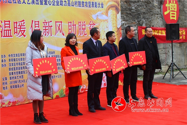 上午九點(diǎn),在原高山村小學(xué)里,不少鄉(xiāng)親們?cè)缭绲鼐蛠?lái)到這里,讓昔日冷清的校園頓時(shí)變得熱鬧起來(lái)。鎮(zhèn)司法所、綜治辦、文化站、共進(jìn)衛(wèi)生院等部門和單位的工作人員熱心向現(xiàn)場(chǎng)的群眾提供健康知識(shí)、法律知識(shí)等咨詢服務(wù),并向他們發(fā)放《中華人民共和國(guó)憲法》、《農(nóng)民法律知識(shí)讀本》、《肺結(jié)核患者健康管理服務(wù)》、《老年人健康管理服務(wù)》等宣傳冊(cè)和宣傳單等。在義寫(xiě)春聯(lián)集中服務(wù)點(diǎn)前,鄉(xiāng)親們把3名正在寫(xiě)春聯(lián)的書(shū)法愛(ài)好者圍個(gè)嚴(yán)實(shí),都爭(zhēng)著請(qǐng)他們給自己寫(xiě)春聯(lián)。表彰大會(huì)在雄壯的國(guó)歌聲中拉開(kāi)帷幕,安康朋成醫(yī)藥連鎖有限公司、安康百家惠醫(yī)藥連鎖有限公司等10個(gè)企業(yè),以及惠生玉、惠波、曹向軍等愛(ài)心人士為高山村共捐贈(zèng)了4萬(wàn)元,用于慰問(wèn)全村110戶貧困戶和支持村上建設(shè),部分愛(ài)心企業(yè)代表和愛(ài)心人士及幫扶高山村的區(qū)市場(chǎng)監(jiān)管局領(lǐng)導(dǎo)上臺(tái)領(lǐng)取了榮譽(yù)證書(shū)。陳廣平等3名優(yōu)秀共產(chǎn)黨員、丁信剛等4名優(yōu)秀“新大員”、孝老愛(ài)親道德模范惠才武、助人為樂(lè)道德模范惠生玉和胡高兵等4名脫貧攻堅(jiān)自強(qiáng)標(biāo)兵分別受到村上的表彰。由安康新時(shí)尚藝術(shù)團(tuán)表演的歌舞、詩(shī)朗誦及當(dāng)?shù)厝罕、學(xué)生表演的花鼓、鑼鼓、舞蹈、快板等12個(gè)精彩節(jié)目,讓廣大群眾在家門口就享受了一次“文化大餐”。