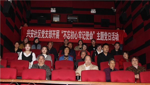 在活動現(xiàn)場,興安社區(qū)黨支部為黨員干部發(fā)放《習近平關于“不忘初心、牢記使命”論述摘編》,并在包聯(lián)單位汪金文的帶領下大家學習了《習近平關于“不忘初心、牢記使命”論述摘編》。社區(qū)年齡偏大的黨員有些字看不清,但熱情高漲,沉浸在濃厚的學習氛圍中!段液臀业淖鎳烦尸F(xiàn)了祖國在中國共產(chǎn)黨的領導下,取得了開國大典、第一顆原子彈爆炸、中國女排三連冠、香港回歸、北京奧運會、抗戰(zhàn)70周年閱兵式等一系列的成就。講述了歷史瞬間下不為人知的普通民眾與祖國同呼吸、共命運的動人故事。隨著劇情的發(fā)展,每一句“中國”,每一聲“中國隊”,每一次國歌響起,每一次國旗升起。黨員和居民臉上露出一語難表的激動,眼中飽含熱淚。