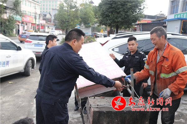 整治行動(dòng)中,整治組采取宣傳教育與現(xiàn)場取締結(jié)合的方式,挨家挨戶宣傳《中華人民共和國大氣污染防治法》、《安康市漢濱區(qū)人民政府關(guān)于劃定高污染燃料禁燃區(qū)的通告》等相關(guān)條例,督促沿街商鋪業(yè)主限期自行整改到位,執(zhí)法隊(duì)員還自備滅火器、剪刀、抹布、鏟刀等工具,對屢教不改使用蜂窩煤爐的頑固商鋪及316國道關(guān)廟鎮(zhèn)轄區(qū)公路沿線各類亂貼亂畫、亂擺亂放的小廣告逐一進(jìn)行徹底清理。當(dāng)天共取締蜂窩煤爐8個(gè),清理各類張貼小廣告40余處,拆除亂扯亂掛橫幅15條,沒收亂擺亂放廣告牌30余個(gè)。