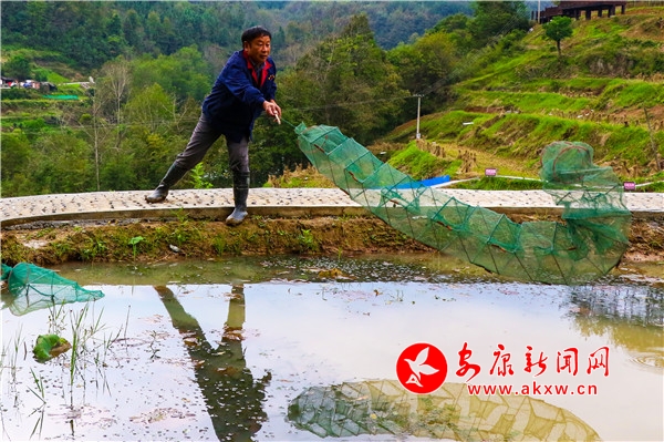 10月12日,漢濱區(qū)縣河鎮(zhèn)財(cái)梁社區(qū)三分良田蝦稻園內(nèi),工人師傅正在安放蝦籠。