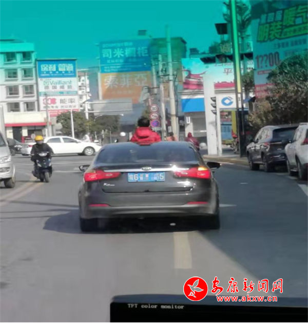 本網(wǎng)訊(通訊員 唐波)2月11日,有網(wǎng)友舉報(bào),一輛小轎車在行駛過(guò)程中,駕駛?cè)朔湃诬囍泻⒆影杨^探出天窗觀賞風(fēng)景,非常危險(xiǎn)。