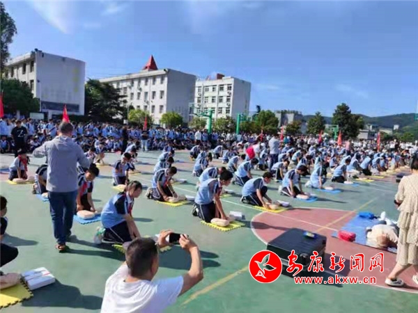 活動中,漢濱區(qū)區(qū)紅十字藍天志愿服務隊的隊員們結合溺水事故案例,對防溺水應急處理、心肺復蘇等救護技能進行了系統(tǒng)的講解和演示。隨后學生們組成的百人演練團在專業(yè)老師的指導下完成了心肺復蘇的實際操作。